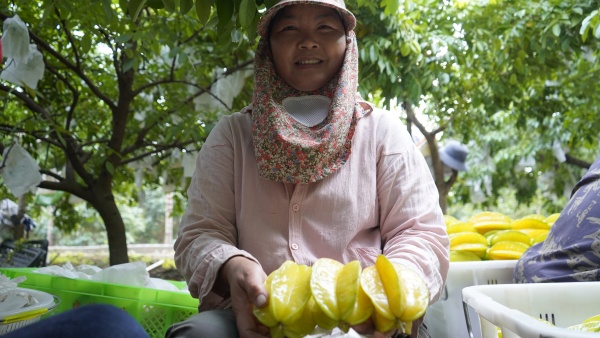 來自成都的旅居游客邱阿姨和同伴也被香甜誘人的楊桃吸引,直接進(jìn)到地里購買?!霸喼笔侨碎g寶藏!水果又多又好。上次來那路村游玩,品嘗到黃澄澄的楊桃,就一直記著這個(gè)味道,這次就迫不及待直接來地里回購!這些楊桃?guī)Щ厝?,家里人肯定高興。”邱阿姨一邊說一邊挑選著楊桃。刀紹沙則幫顧客分揀、包裝好,并叮囑存放竅門。