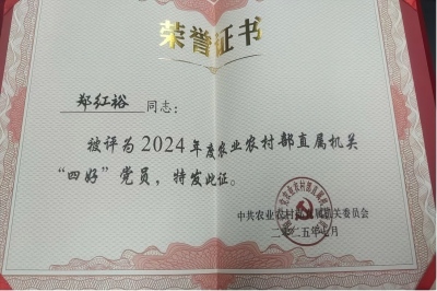 鄭紅裕同志獲評2023—2024年度農(nóng)業(yè)農(nóng)村部直屬機關優(yōu)秀共產(chǎn)黨員。