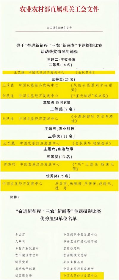 在農(nóng)業(yè)農(nóng)村部直屬機關工會組織的“奮進新征程‘三農(nóng)’新畫卷”主題攝影比賽中,中心榮獲優(yōu)秀組織單位,11項作品獲獎:王藝越同志榮獲1項二等獎、1項三等獎;劉秋池同志榮獲1項二等獎、1項三等獎;王琦雅同志榮獲1項三等獎;陳慧昀同志榮獲1項三等獎;馬晨雨、楊雅娜、羅菁菁、趙曉旭、桂丹五位同志榮獲優(yōu)秀獎。