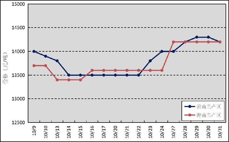 國(guó)內(nèi)主產(chǎn)區(qū):云南產(chǎn)區(qū)天氣狀況較好,割膠作業(yè)有序恢復(fù),原料供應(yīng)小幅增量。海南產(chǎn)區(qū)臺(tái)風(fēng)、降水天氣擾動(dòng)偏多,對(duì)割膠作業(yè)影響明顯,新膠上量節(jié)奏緩慢,產(chǎn)區(qū)旺產(chǎn)季供應(yīng)不旺特征凸顯。云南、海南鮮膠乳(折干膠)月均價(jià)格分別為13824元/噸、13753元/噸,環(huán)比分別下跌717元/噸、783元/噸。