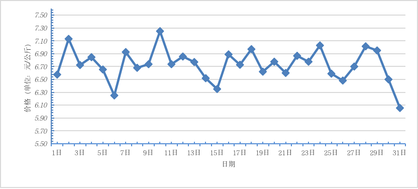 5月,全國重點(diǎn)監(jiān)測農(nóng)產(chǎn)品批發(fā)市場香蕉總交易量達(dá) 1.9萬噸,同比下降79.5%,環(huán)比下降9.5%;總交易價(jià)值 13750.7萬元,同比下降69.9%,環(huán)比下降17.9%。日平均價(jià)格最高為7.3元/千克,最低為6.0元/千克,全月平均價(jià)格為 6.7元/千克,同比上漲31.3%,環(huán)比上漲3.1%(每日價(jià)格變化如圖)。