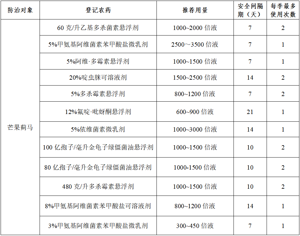表 防治芒果薊馬可供選用的登記農(nóng)藥產(chǎn)品相關(guān)信息