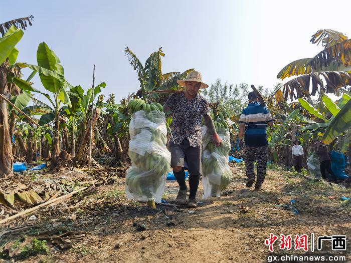 中新網(wǎng)廣西新聞12月15日電(陸柔宇)“今年這季香蕉長勢特別好,畝產(chǎn)保守估計(jì)也有七八千斤,拉到甘肅、浙江肯定能賣個(gè)好價(jià)錢?!痹趶V西桂平市金田鎮(zhèn)安眾村,數(shù)百畝香蕉林長得格外茂盛,一串串青蕉掛在枝頭,脫貧戶林壽寬望著裝滿剛采收青蕉的貨車,一臉喜悅。