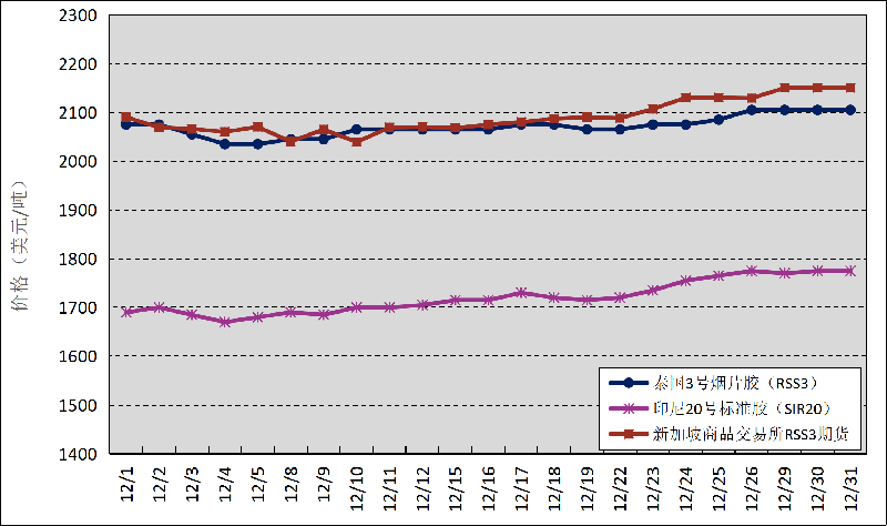 國外主產(chǎn)區(qū):12月,泰國3號煙片膠(RSS3)平均價(jià)格2071美元/噸,環(huán)比上漲23美元/噸,最高價(jià)2105美元/噸,最低價(jià)2035美元/噸;印尼20號標(biāo)準(zhǔn)膠(SIR20)平均價(jià)格1720美元/噸,環(huán)比上漲38美元/噸,最高價(jià)1775美元/噸,最低價(jià)1670美元/噸;新加坡商品交易所RSS3期貨主力合約月均結(jié)算價(jià)格2090美元/噸,環(huán)比上漲43美元/噸,最高價(jià)2150美元/噸,最低價(jià)2039美元/噸。