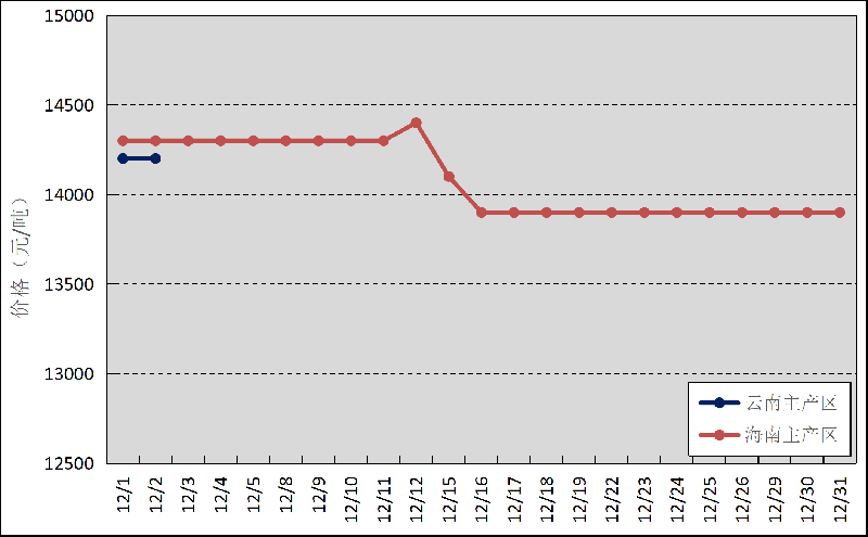 國內(nèi)主產(chǎn)區(qū):12月,云南產(chǎn)區(qū)全面停割,海南產(chǎn)區(qū)逐步停割。云南、海南鮮膠乳(折干膠)月均價(jià)格分別為14200元/噸、14087元/噸,分別環(huán)比上漲279元/噸、下跌192元/噸。