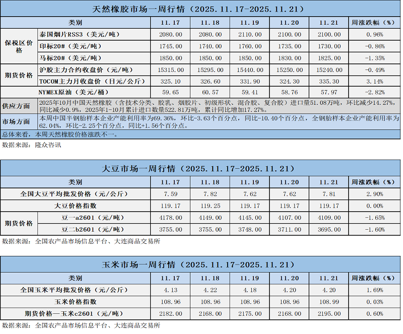 天然橡膠、大豆、玉米市場一周行情(2025.11.17-11.21)