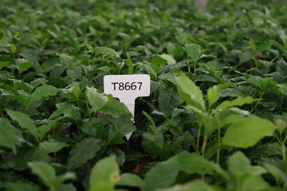 走進咖啡育苗基地,智能溫室大棚內一片生機盎然。正是育苗關鍵期,“瑰夏”“T8667”“薩奇姆”等多個品種的20萬余株咖啡苗整齊排列,在標準化苗床上茁壯成長。