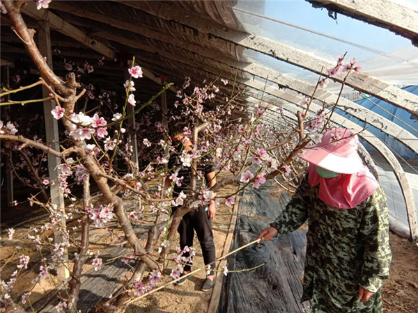 與此同時,在位于江南茶區(qū)郎溪縣的農(nóng)墾十字鋪茶場3萬畝茶園里,茶農(nóng)們正在對茶樹進行修邊、打頭、施肥,著手做好采茶準備。而在黃河故道旁邊的碭山果園場果樹大棚里,桃花、杏花競相開放,職工正抓緊授粉。種植戶周華萍說,“往年授粉都要雇不少人,今年由于疫情,防止扎堆,沒有雇人,搶抓時間,爭取授上粉,座上果,不減收?!蹦壳肮麍@場800畝大棚果樹大部分已經(jīng)完成授粉工作。