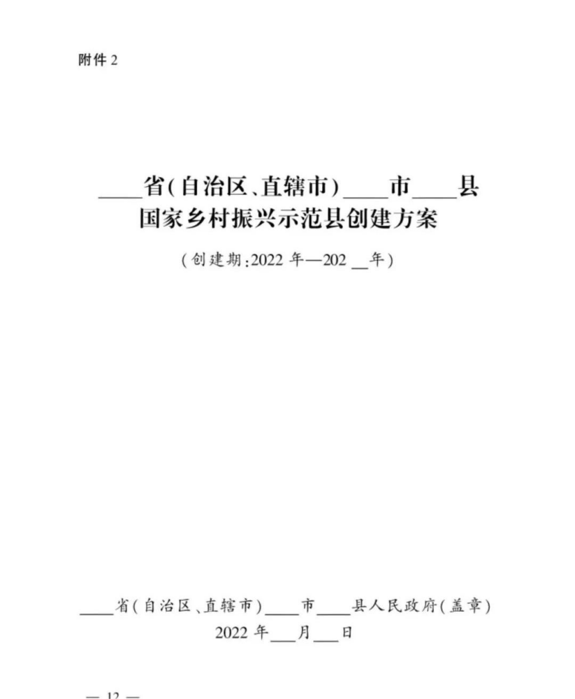 (一)創(chuàng)建程序。國家鄉(xiāng)村振興示范縣按照“縣級政府申請,市級部門擇優(yōu)遴選,省級部門審核并報省級政府同意,農業(yè)農村部、國家鄉(xiāng)村振興局批準創(chuàng)建”的程序,開展申報創(chuàng)建工作。各地嚴格按照《2022年鄉(xiāng)村振興示范創(chuàng)建名額分配表》(附件1)申報創(chuàng)建,超出指標數(shù)的不予受理。省級農業(yè)農村部門會同鄉(xiāng)村振興局,指導申報創(chuàng)建的縣級政府認真編制《國家鄉(xiāng)村振興示范縣創(chuàng)建方案》(附件2),經省級人民政府同意后,報農業(yè)農村部、國家鄉(xiāng)村振興局。新疆生產建設兵團、計劃單列市、直屬墾區(qū)直接報農業(yè)農村部、國家鄉(xiāng)村振興局。請于8月30日前提交申報材料,其中紙質申報材料一式3份,同步發(fā)送電子版至xczxc@agri.gov.cn(郵件標題注明:×省×縣申報國家鄉(xiāng)村振興示范縣材料),超期不予受理。